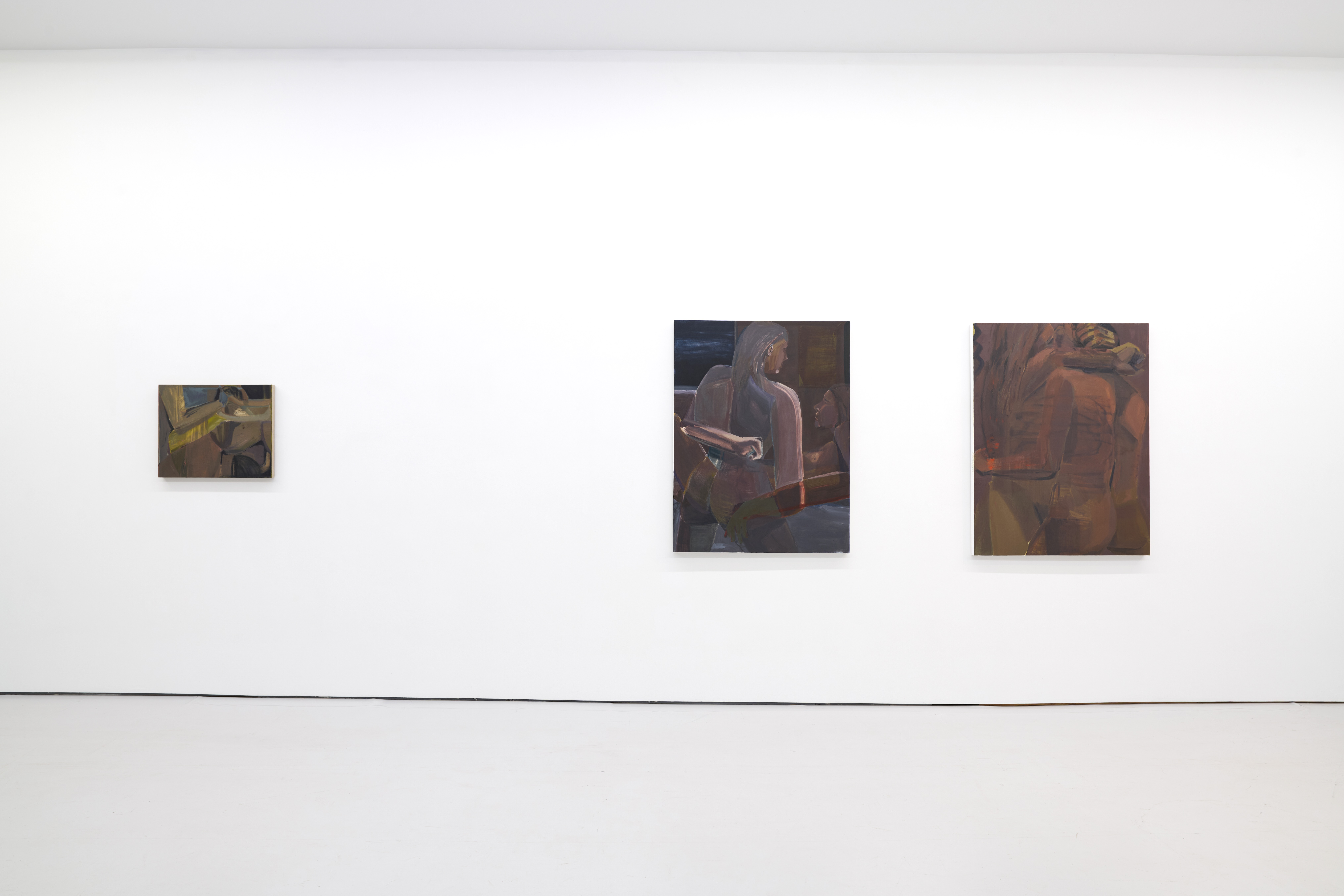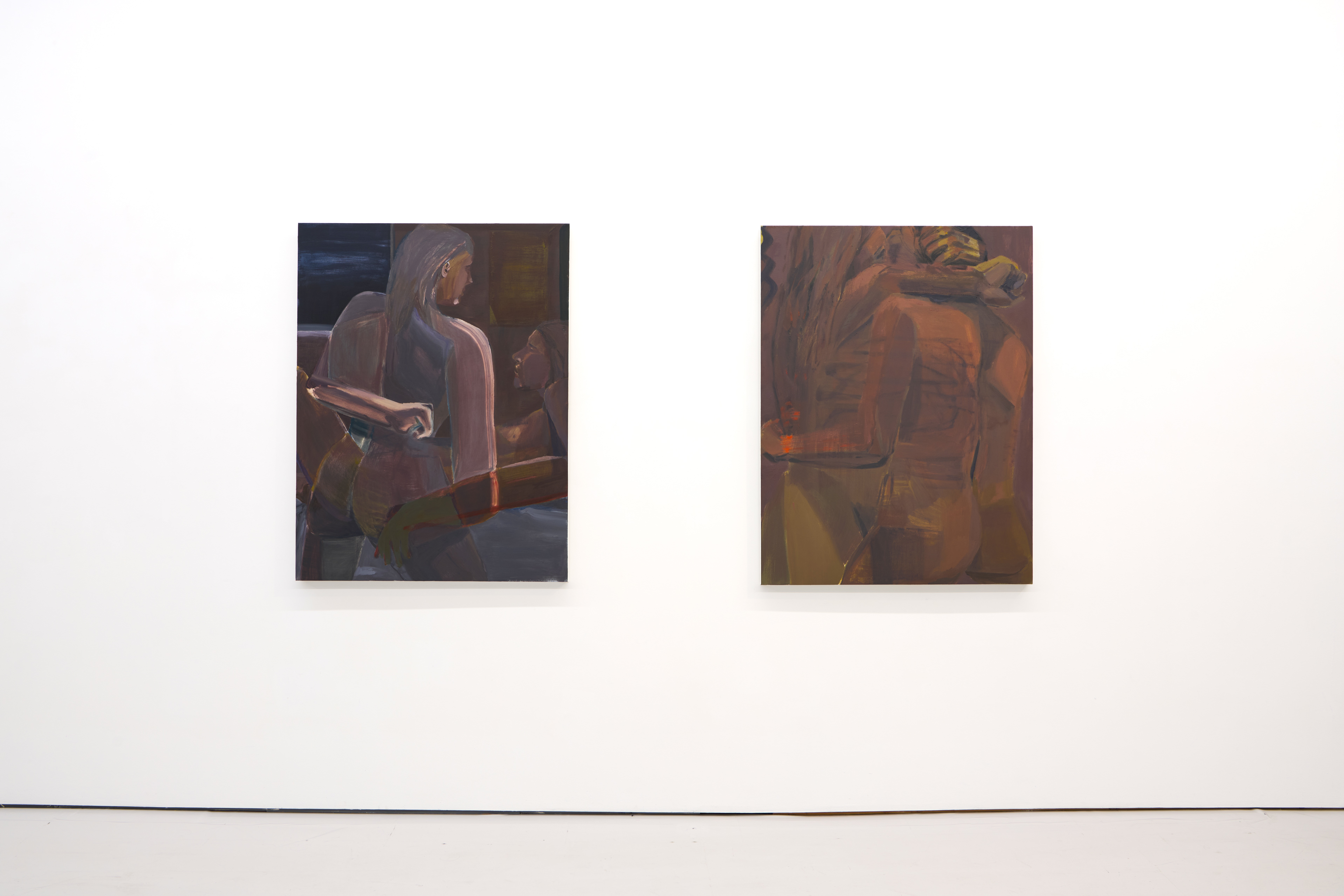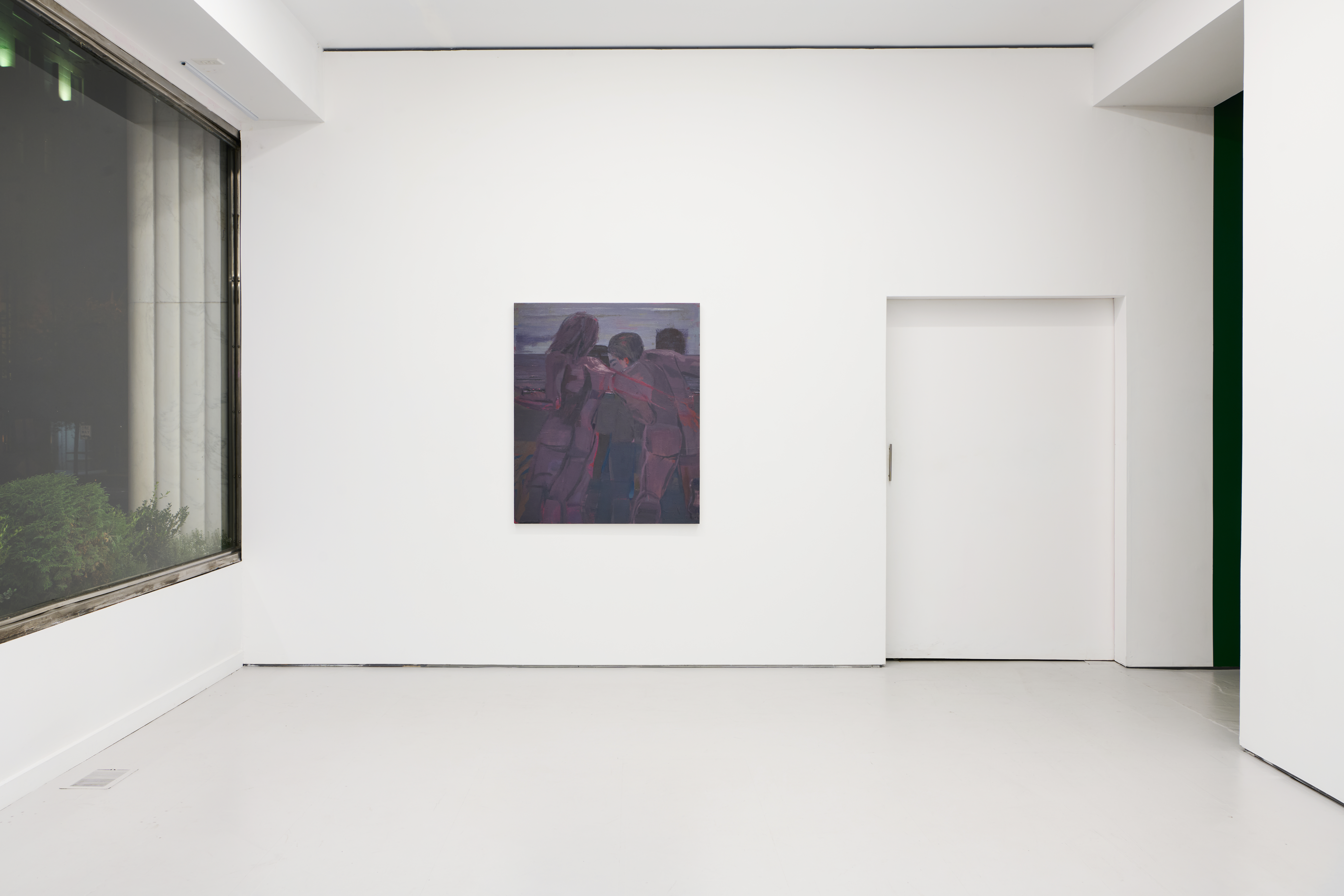 In one of Holmes’ twilit scenes, Hinge Point, a mauve woman tensely approaches a reclined figure with a fist clenched behind her back. What is the gesture’s intent? Is it an expression of secrecy, resentment, desire? The other figure, staring into space, doesn’t register the approach. Subtly attuned to interpersonal dynamics, Holmes’ layered films of paint give a sense of porous spillage from one body to the next, as the scales of the encounter tip from balanced intimacy to longing desperation. This is one of Holmes’ foremost talents: the ambiguous gestures of her works are capable of being interpreted backwards and forwards, once as the evocation of shared tenderness and once as the impossibility of knowing the person one loves.