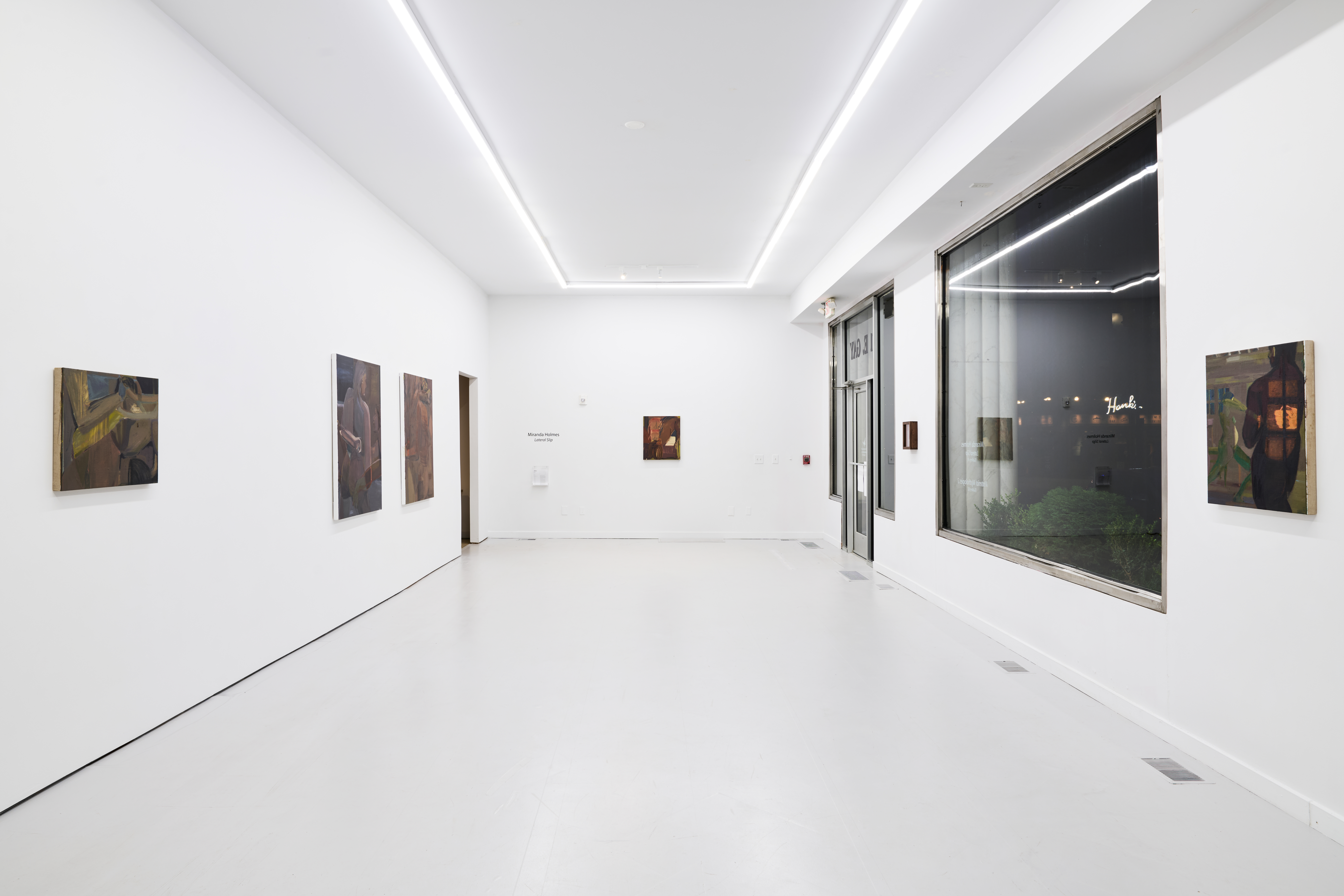 Rendered in a sunken color palette, the hazy nocturnal atmosphere of these paintings evokes the difficulty of interpreting the shared space of a relationship. Even the seemingly most straightforward depictions, such as the melting embrace of two lovers in the work, Low Heat, reflects the aporia of relationships. The ferocity of the catapult into the lover’s arms almost overshadows the affection of the embrace, pointing to the fact that physical contact serves just as often a means of avoiding intimacy as establishing it. While Holmes’ oeuvre is populated by one figure staring down another, the more precarious micromoment of mutual eye contact rarely takes place. In her painting, American Wavers, which travels outside the confines of the domestic interior to an equally claustrophobic political demonstration, Holmes leverages the disengaged stare of the participants for maximum eeriness, leaving the viewer to wonder whether this is a march of solidarity or a subtle display of one-upmanship.